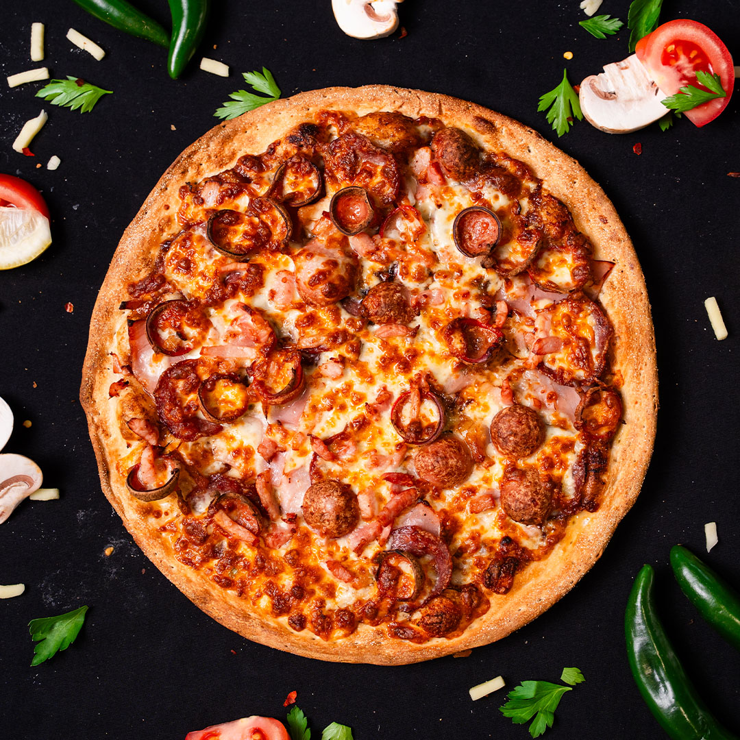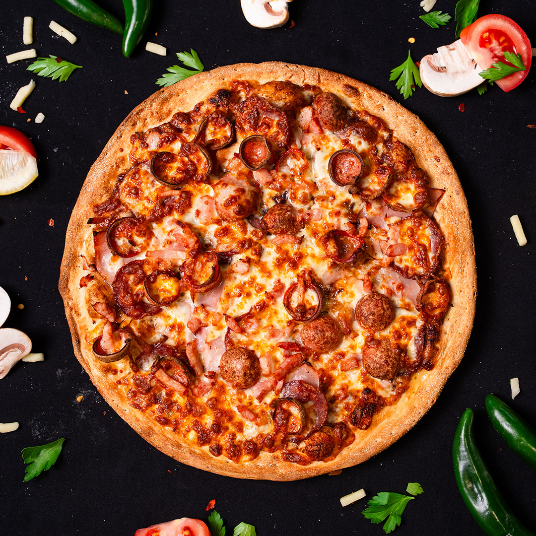 Lrg Supreme Tomato Base, Smoked Ham, Pepperoni, Bacon, Salami, Olives, Fresh Mushrooms, Green Capsicum, & Spanish Onions