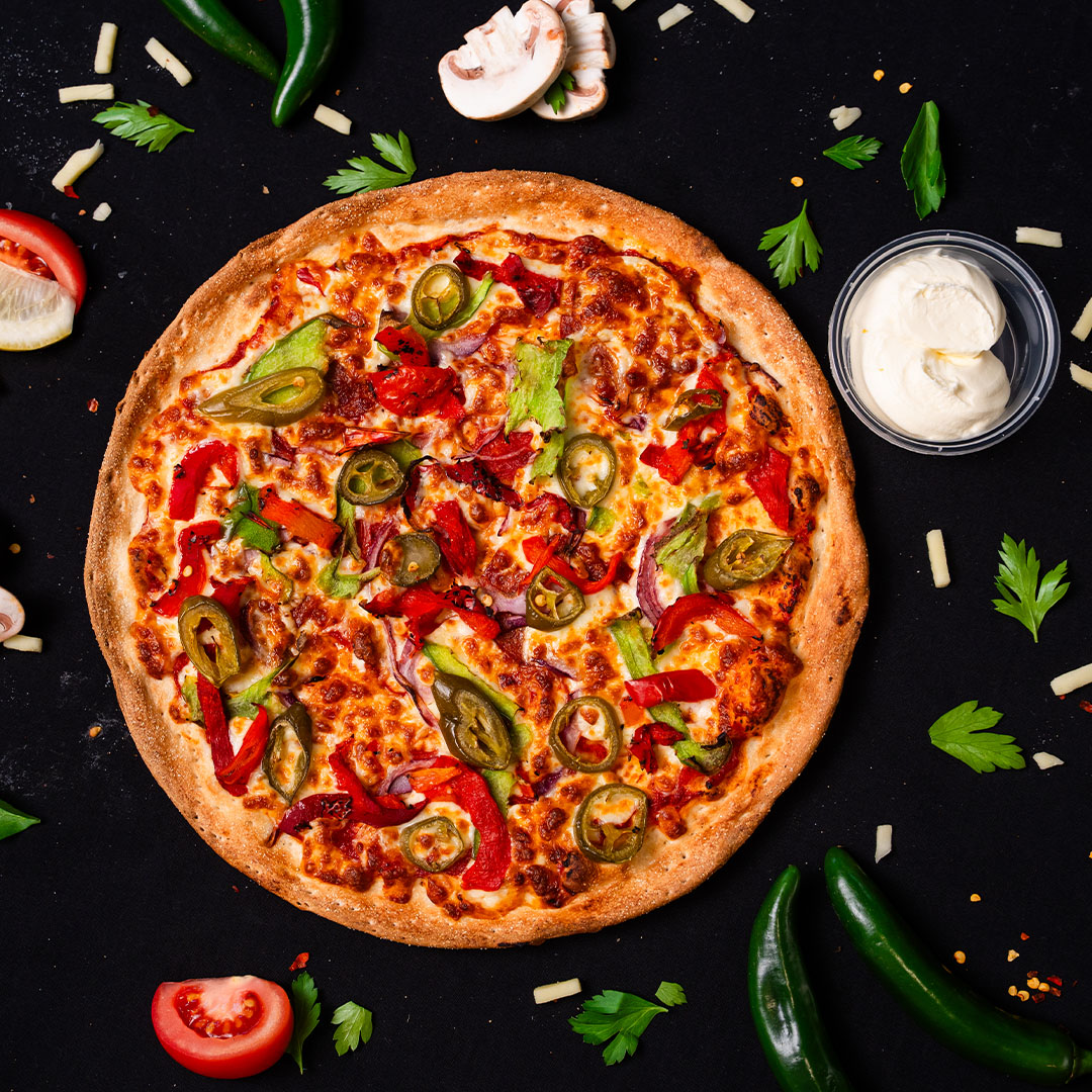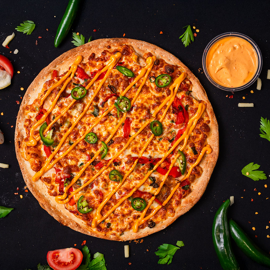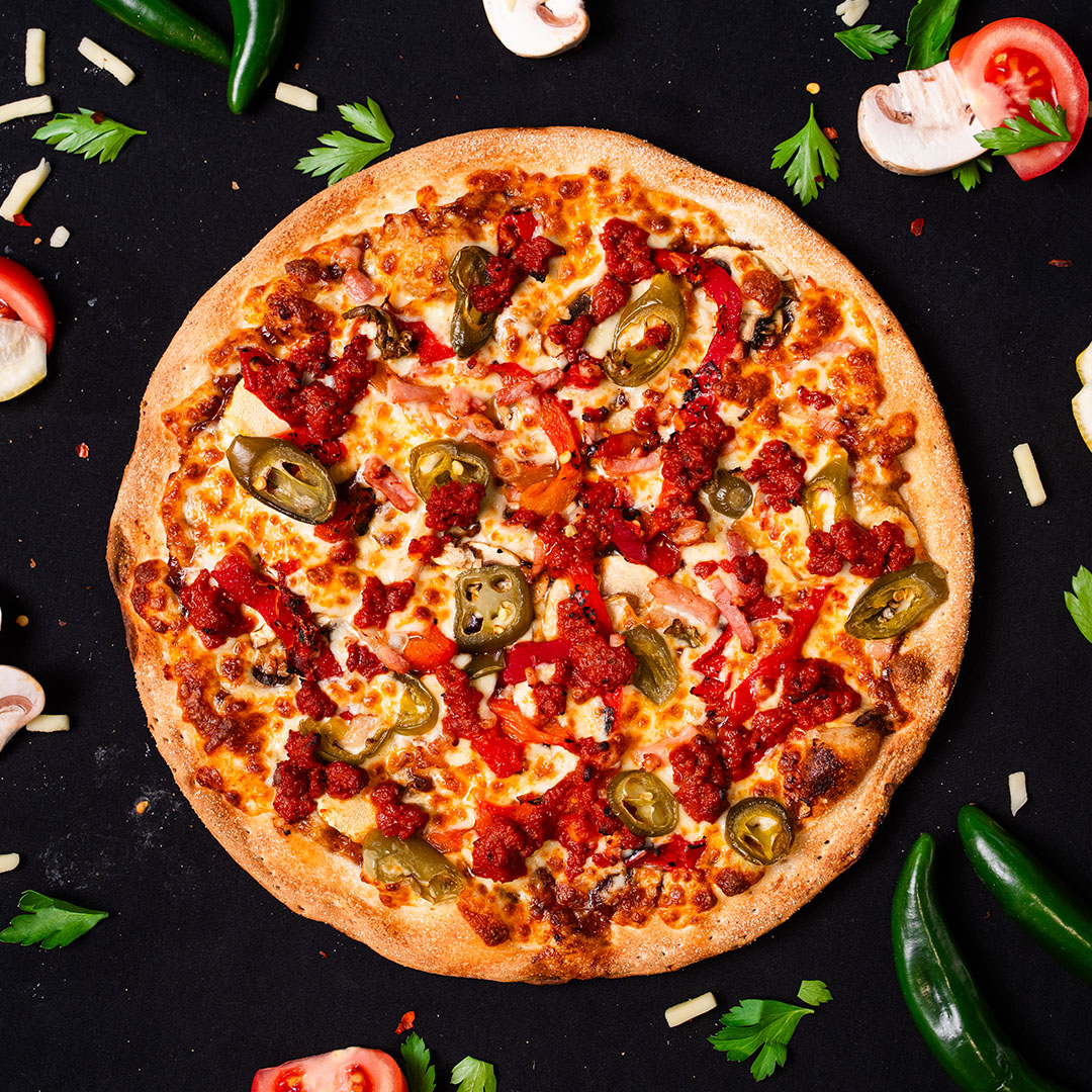 Lrg Mexican  Tomato Base, Chorizo, Red and Green Capsicum, Jalapenos & Spanish Onion, with Sour Cream (Optional)