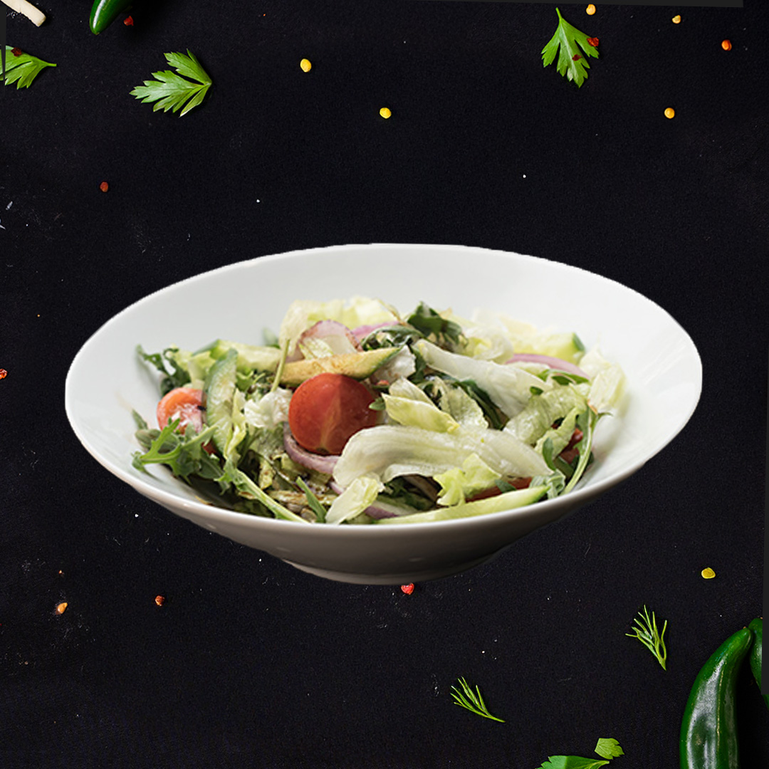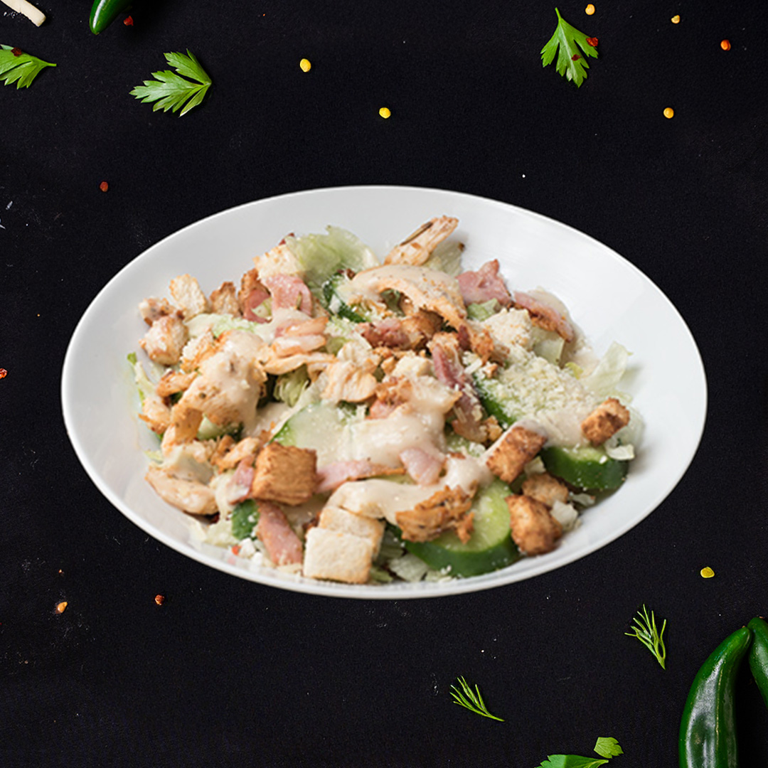 Lrg Greek Village Tomato Base, House Cooked Chicken, Feta, Roma Tomatoes, Kalamata Olives, dressed with Pesto Sauce