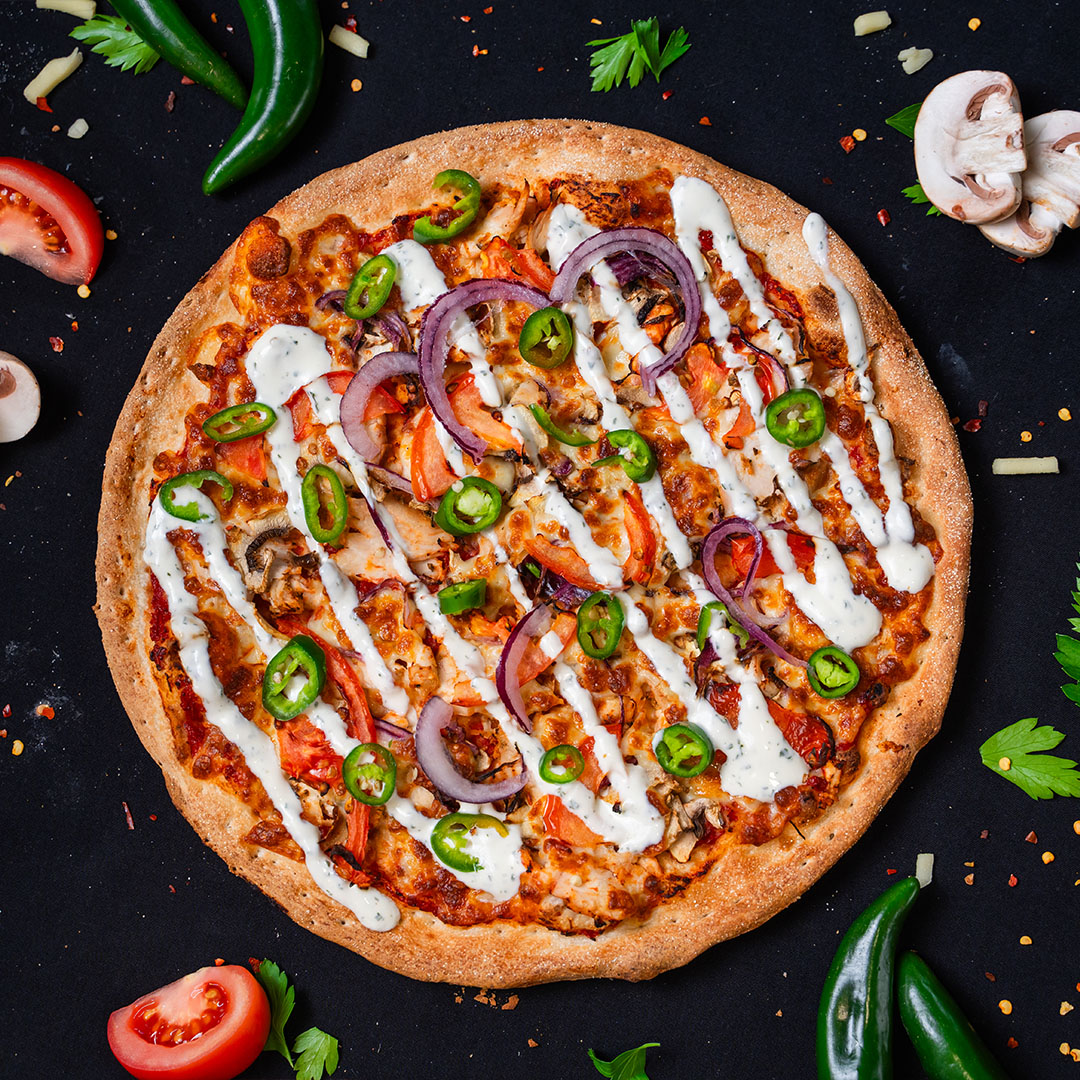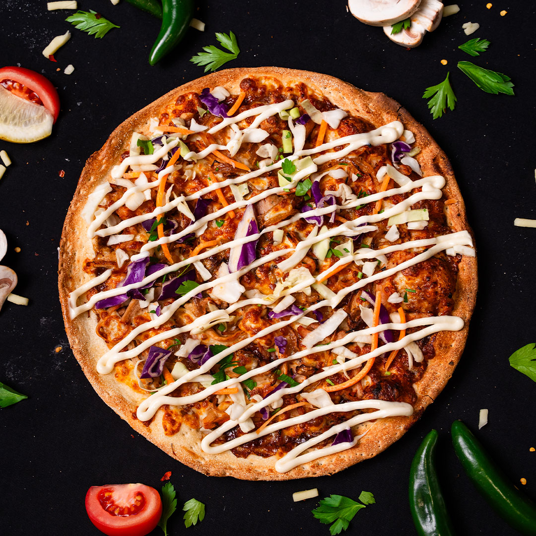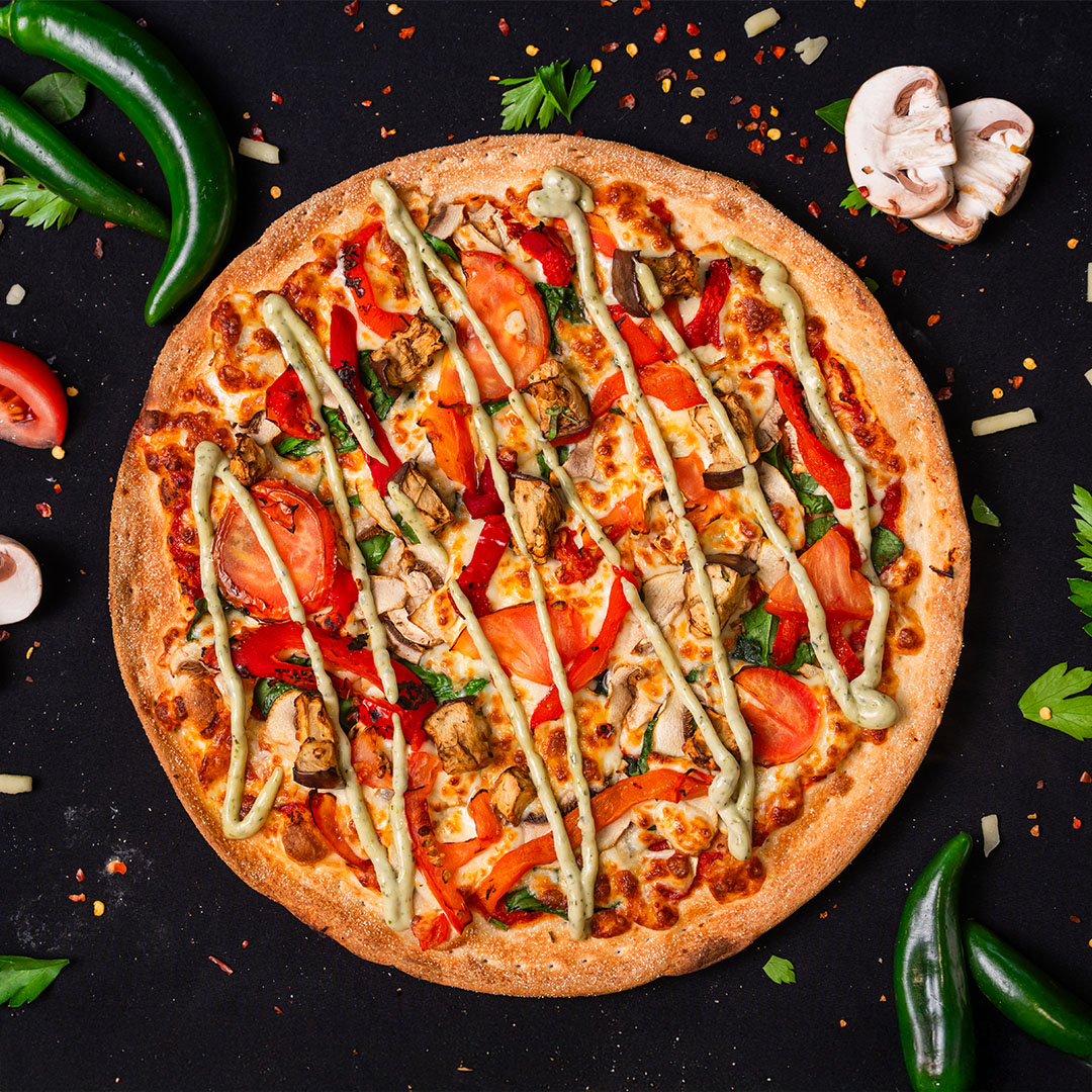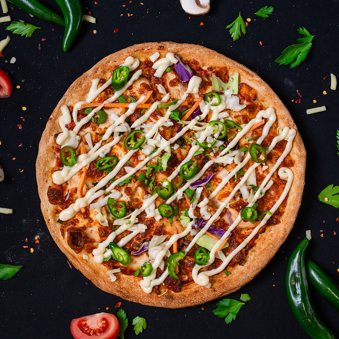 Lrg Tandoori Tandoori Base, House Cooked Chicken, Roma Tomato, Spanish Onion, Mushrooms, Topped with Mint Youghurt and Fresh Chillies