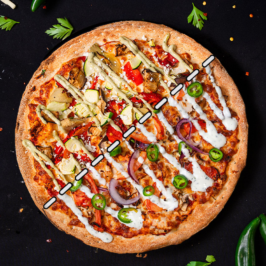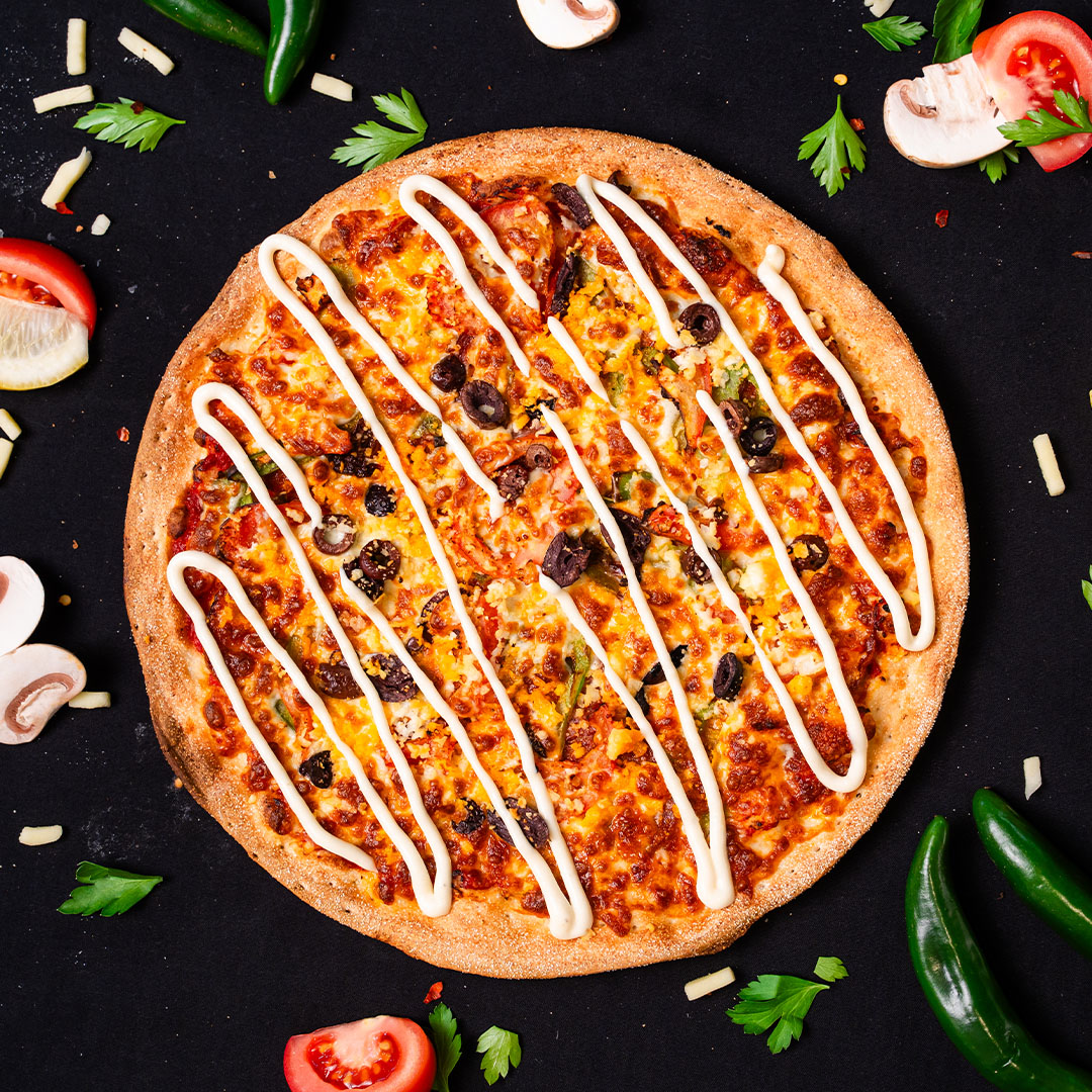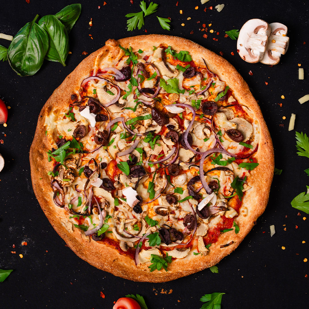 Lrg Vegan Veggo   Tomato Base, Vegan Cheese, Onion, Mushroom, Olives and dressed with Olive Oil and Parsley