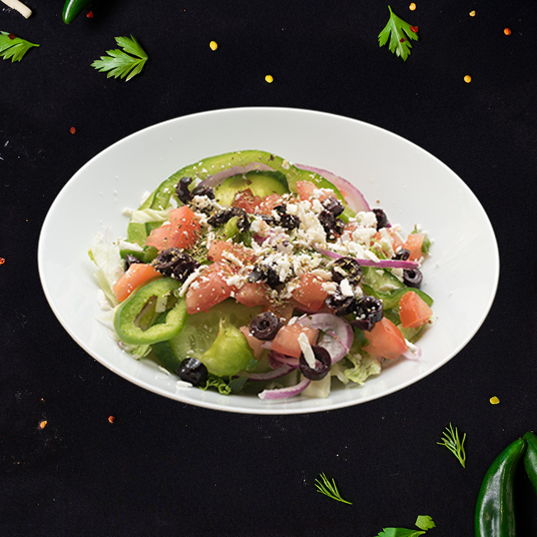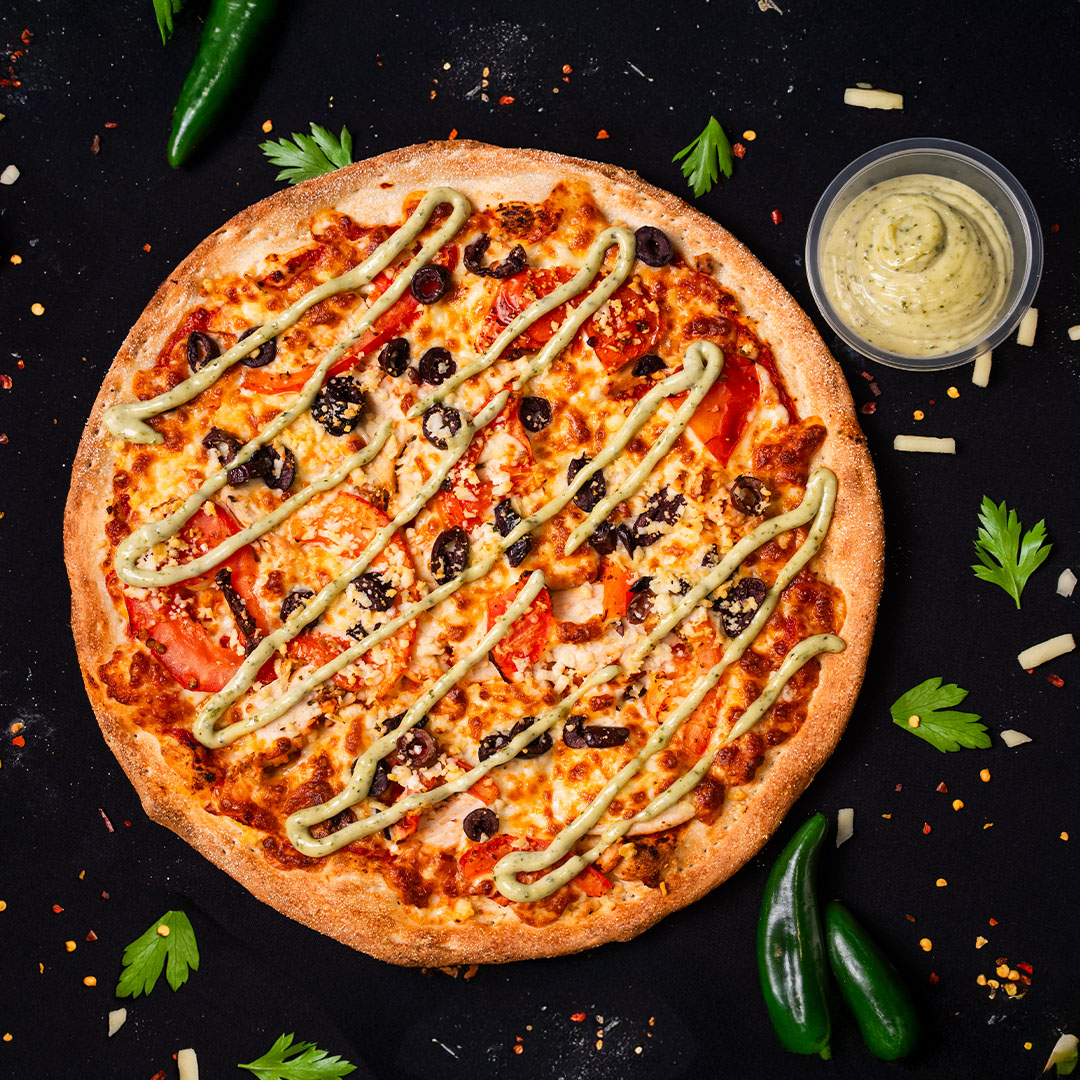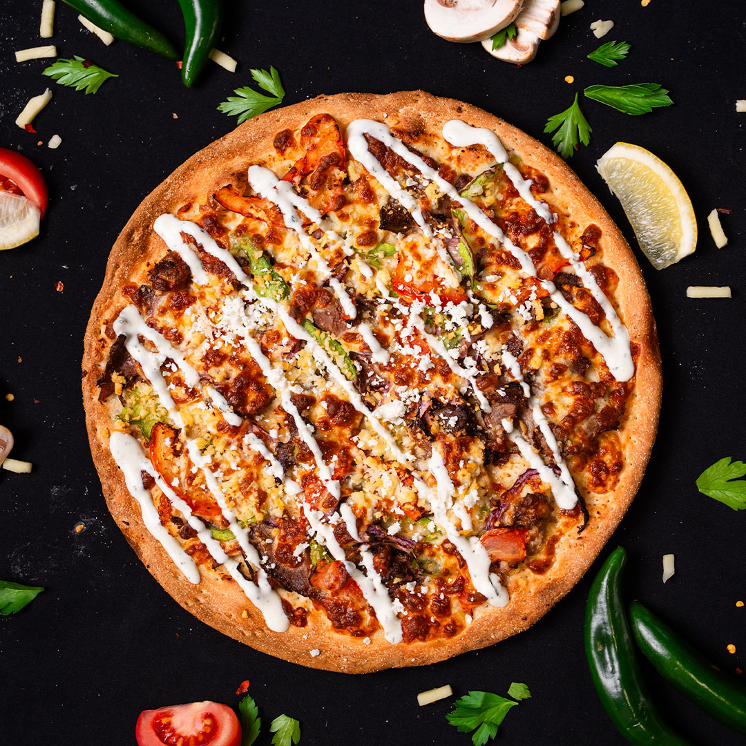 Lrg Greco Tomato Base, Salami, Chorizo, Green Capsicum, Tomato, Kalamata Olives, Feta, & Dressed with Garlic Aioli