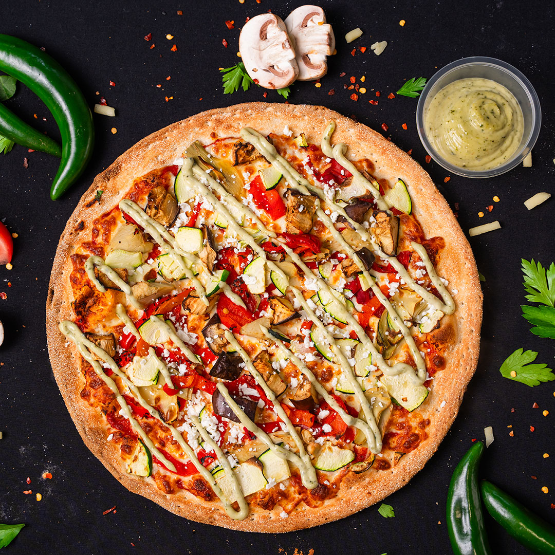 Lrg Vegetarian Supreme Tomato Base, Fresh Mushroom, Red Capsicum, Spinach, Roma Tomato, Eggplant, dressed with Pesto Aioli