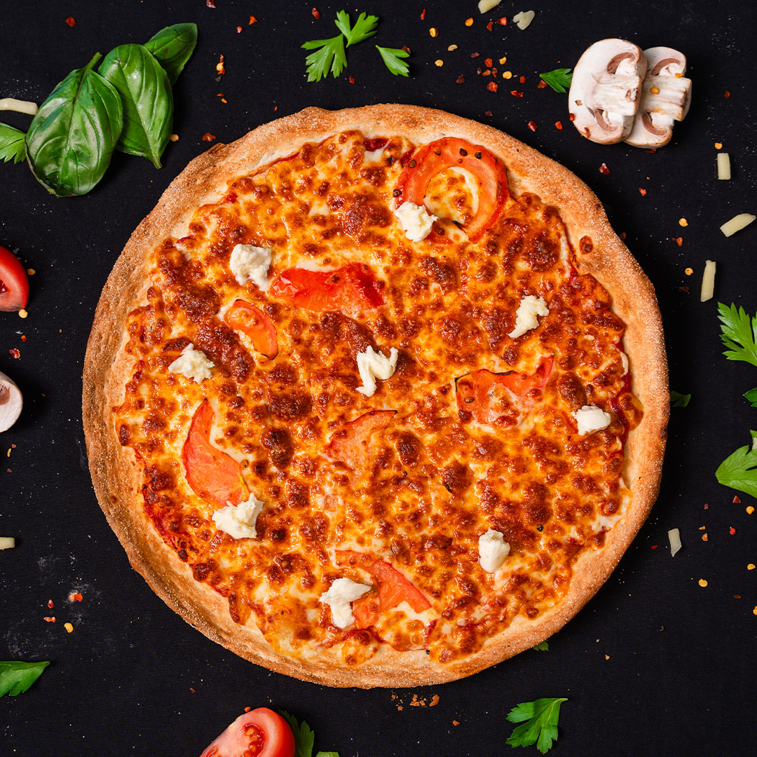 Lrg New Margherita Tomato Base, Roma Tomato, Basil Leaves And Bocconcini