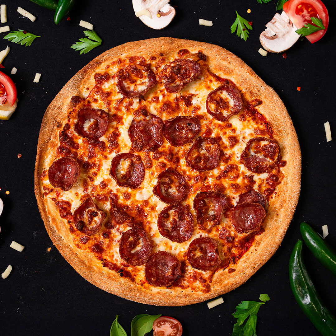 Lrg Big Show Pizza Tomato Base, Cabanossi, Pepperoni, Ham & Bacon