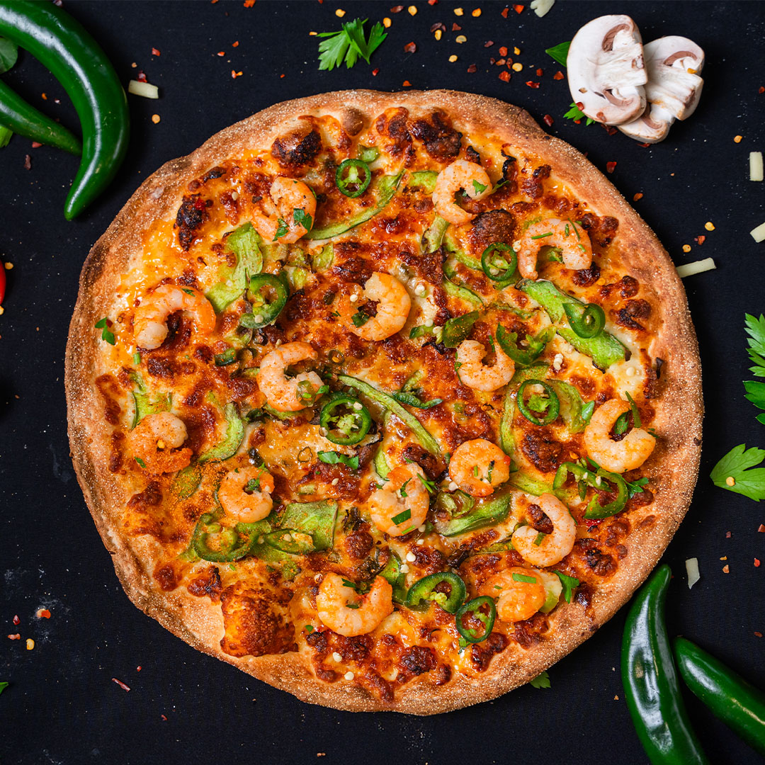 Lrg Pitsa Prawn Tomato Base, Marinated King Prawns With Garlic, Wild Oregano, Chillies and Tomato