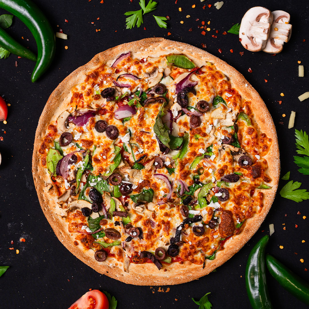 Lrg Veggie Lovers Tomato base, Spinach, Mushrooms, Onions, Green Capsicum, Olives and Feta